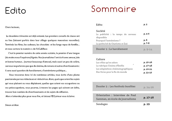 C’est le premier numéro de cette année scolaire, le premier d’une longue (du moins nous l’espérons) lignée. Nos journalistes l’ont écrit avec amour, joie et bonne humeur… (surtout beaucoup d’amour), mais aussi un peu de colère, car nous ne parlerons pas que de cinéma, de romans et autres divertissements : il sera aussi question de harcèlement, d’extrémisme politique...