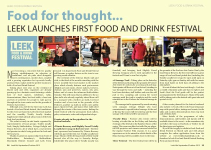 Council it is hoped Leek Food and Drink Festival will become a regular fixture on the town’s ever growing social calendar. The weekend of the festival, March 15th and 16th, is the third of the month coinciding with the town’s monthly fine food market in the market place which already features such gastronomic delights as local meats, cheese makers, brewers, chutney, jam and preserves, sauces, oils, pies, bakers and of course the infamous Staffordshire Oatcake. This will mean that in addition to the 30 plus stalls who already regularly attend there will be a marquee with a further 40 stalls, hot food vendors and a beer tent in the grounds of the Foxlowe, another 15 stalls in Leek’s new public space, Sparrow Park, and many other stalls sited through the streets of the town centre, linking the whole festival with the permanent food outlets, pubs, restaurants, cafes and independent shops. Events already in the pipeline for the festival include: •Titanic Brewery and Slightly Foxed Totally Locally beer swap in the beer tent - Th ?? ?????????????????????????????Q?????? ???????????????????????????????Q??????1??????????????Q????????????????????????????????????????????????????????????M????? ??????
