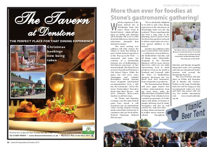 ith the expansion of the main festival site at Westbridge Park, this year’s Stone Food & Drink Festival – which will take place on Friday 4th, Saturday 5th & Sunday 6th is set to offer its foodie followers a host of new attractions, alongside firm festival favourites. The most exciting new addition will offer visitors the chance to enjoy fine dining as part of their festival experience at the ‘Pop up in the Park’ – a restaurant and piano bar courtesy of a partnership between two of Staffordshire’s best-known purveyors of fine food and drink; The Moat House at Acton Trussell and Tittensor’s Old School Wines. While the piano bar will serve wine, champagne and cocktails throughout festival opening hours alongside hand-picked accompaniments from a deli bar, the restaurant - led by The Lewis Partnership’s Executive Head Chef Matt Davies - will serve delicious three-course lunches on all three days. On Friday and Saturday evenings, once the main festival gates have closed, it will transform into an independent venue serving elegant evening meals and drinks exclusively to customers who pre-book tables. Festival Chairman, Richard Stevens says:
