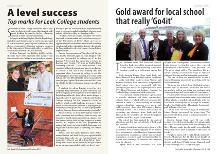 wo students from The Meadows Special School in Leek enjoyed the proudest moment of their school careers when they travelled to London to pick up a gold award earlier this year. Sixth formers Emma Keen from Leek and James Hancock from Biddulph visited the House of Lords with their teachers Joan Wright and Yvonne Thirlaway from the school, in Springfield Road where they were presented with the prestigious gold award, the highest possible, from HTI (Head Teachers and Industry Limited) to celebrate their engagement with employers. HTI, a national charity dedicated to giving back to schools, students and their communities, believes that every child will have increased life chances if there is a close working relationship between education, business, government and public services. And, after HTI manager Tracey Giddings visited The Meadows, which takes in secondary age students from Leek, and the Moorlands, she awarded the school the highest possible accolade – a gold Go4it award. The school has been praised for its spirit of adventure and the ‘can do’ attitude of both staff and students. A framed certificate and pewter Oscar’s style statuette is now proudly displayed in the school foyer as testament to the Meadows’ demonstrating a commitment to creating a culture that develops innovation, creativity and entrepreneurship to inspire and challenge all learners and improve their life chances. Deputy head at The Meadows, Mrs Joan