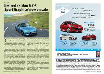 elivering top-of-the-range specification, unique styling and sporty performance, the Mazda MX-5 ‘Sport Graphite’ Roadster Coupe is on sale now and perfect for summer. Offering Mazda customers a stunning new limited edition of the world’s best-selling twoseater sportscar, the urban inspired design of the new model’s exterior features and eye-catching paint finishes are what makes this model unique. Aquatic Blue Mica, Zeal Red Mica or Aluminium Silver Metallic – with a contrasting ‘Meteor Grey’ retractable hard top roof create a highly distinctive appearance. The ‘Sport Graphite’ model is available with two engine options: the spirited 126ps, 1.8-litre or the sporty 160ps, 2.0litre. Both derivatives feature the generous equipment levels of the standard model enhanced with an array of extra items. Every ‘Sport Graphite’ gains 17-inch dark gunmetal alloy wheels, black leather heated seats with unique grey stitching, 5.8-inch TomTom navigation system with integrated Bluetooth® hands-free kit, g ???H\???^H?\?[??\?????\?X??[?[?]Y?]?X?X?H\?]????[???Z\????[[???Z?[??Y][??^K[?[Z]YY][??Y?\??H^\?[?[?[?\?[??H\?Y??Y\??????Y??H[?\?[????H???\]K?]H[?\]YH?^H?]?[??^[?Y?HX]\??Y\?[???Y[[?[???Z?N?????H\???^H?Y\?[???Y[???\?[?\???\?[?[?[?[?HY[?]?[?V