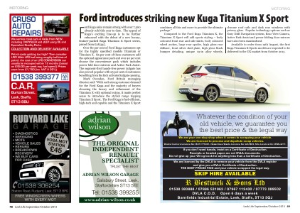 combines all this and more to provide the ultimate package.” Compared to the Ford Kuga Titanium X, the Titanium X Sport will add sports styling – body coloured front rear and side skirts, body coloured wheel arches, large rear spoiler, high gloss rear diffuser, front silver skid plate, high gloss black bumper detailing, unique 19-in alloy wheels, chrome roof rails and dark rear windows with privacy glass. Popular technology options such as Sony DAB Navigation system, Rear View Camera, Active Park Assist and power folding door mirrors have also been standardised. Available to order from 19th August, the first Kuga Titanium X Sports models are expected to be delivered to the UK market from October 2013.