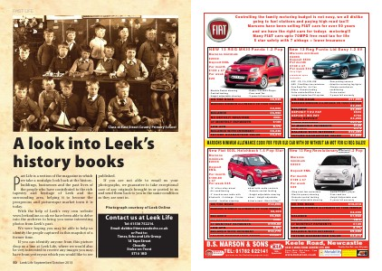 ast Life is a section of the magazine in which we take a nostalgic look back at the history, buildings, businesses and the past lives of the people who have contributed to the rich tapestry and heritage of Leek and the surrounding area, helping it to become the prosperous and picturesque market town it is today. With the help of Leek’s very own website www.leekonline.co.uk we have been able to delve into the archives to bring you some interesting photos from Leek’s past. We were hoping you may be able to help us identify the people captured in this snapshot of a former time. If you can identify anyone from this picture drop us a line at Leek Life, where we would also be very interested to receive any images you may have from yesteryear which you would like to see 50 Leek Life September/October 2013