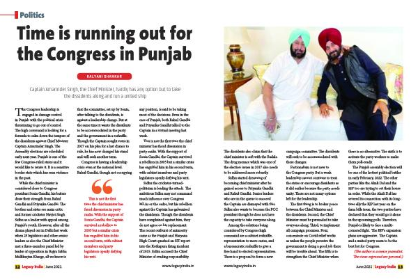12 Legacy India | June 2021 that the committee , set up by Sonia , after talking to the dissidents , is against a leadership change . But at the same time it wants the dissidents to be accommodated in the party and the government in a reshuffle . Though the Captain sought votes in 2017 on his plea for a last chance to rule , he has now changed his stand and will seek another term .
