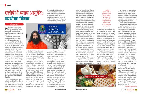एलोपैथी और आयुववेद को लेकर पिछले कु छ दिनों से देश में जंग छिड़ी हुई है । आईएमए और बाबा रामदेव की आपसी बयानबाजी से कोविड की वर्तमान पररपस्पतयों में आम आदमी पर कया प्रभाव पड़ रहा होगा इस विषय में सोचे बिना दोनों में विवाद जारी है । हालांकि बाबा रामदेव द्ारा अपना बयान वापस ले लिया गया है लेकिन फिर भी इंडियन मेडिकल एसोसिएशन बाबा पर एक हजार करोड़ रुपए की मानहानि के दावे के साथ नयायालय पहुंच गया है । इतना ही नहीं दोनों के बीच का विवाद देशद्रोह के आरोपों तक पहुंच गया है । एक तरफ रामदेव को कॉरपोरेट बाबा और वयापारी बाबा जैसे विशेषण दिए गए तो आईएमए पर पंखा , तेल , साबुन , पेंट और बलब जैसी वसतुओं को प्रमाणित कर उनका प्रचार करने के आरोप लगे । भाजपा नेता कपिल मिश्रा ने तो यहाँ तक कहा कि जिन विदेशी कं पनियों से पैसा लेकर आईएमए सर्टिफिके ट बांट रहा था उसकी दुकान बाबा के कारण ठपप हो रही है । कु ल मिलाकर ऐसा प्रतीत होने लगा कि पूरे के पूरे विवाद का कारण वयावसायिक प्रतिसपधामा है ।