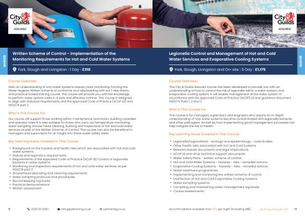 This City & Guilds Assured course has been developed to provide you with an understanding of how to control the risk of legionella within a water system , and evaporative cooling system . It will enable management of the water system in accordance with the Approved Code of Practice ( ACOP ) L8 and guidance document HSG274 Parts 1 , 2 and 3 .