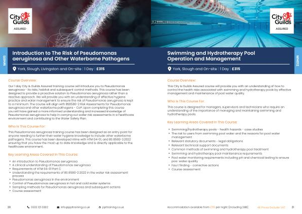 This City & Guilds Assured course will provide you with an understanding of how to control the health risks associated with swimming and hydrotherapy pools by effective management and maintenance of pool water quality .