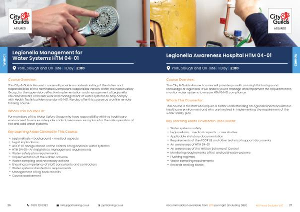 This City & Guilds Assured course will provide an understanding of the duties and responsibilities of the nominated Competent Responsible Person , within the Water Safety Group , for the supervision , effective implementation and management of Legionella risk assessments , remedial work and management of water systems to help comply with Health Technical Memorandum 04-01 . We also offer this course as a online remote training course .