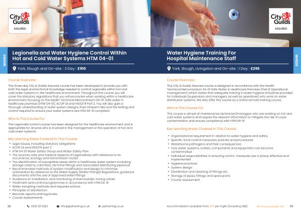 This three day City & Guilds Assured course has been developed to provide you with both the legal and technical knowledge needed to control Legionella within hot and cold water systems in the healthcare environment . Throughout this course you will cover the statutory regulations that you will encounter when working within a healthcare environment , focusing on the Health Technical Memorandum 04-01 : Safe water in healthcare premises ( HTM 04-01 ), ACOP L8 and HSG274 Part 2 . You will also gain a thorough understanding of water system designs , their inherent risks and the testing and control required to ensure your water systems are HTM 04-01 compliant .