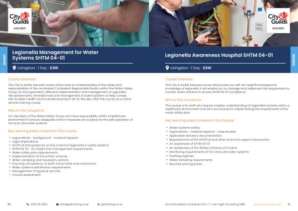This City & Guilds Assured course will provide an understanding of the duties and responsibilities of the nominated Competent Responsible Person , within the Water Safety Group , for the supervision , effective implementation and management of Legionella risk assessments , remedial work and management of water systems to help comply with Scottish Health Technical Memorandum 04-01 . We also offer this course as a online remote training course .