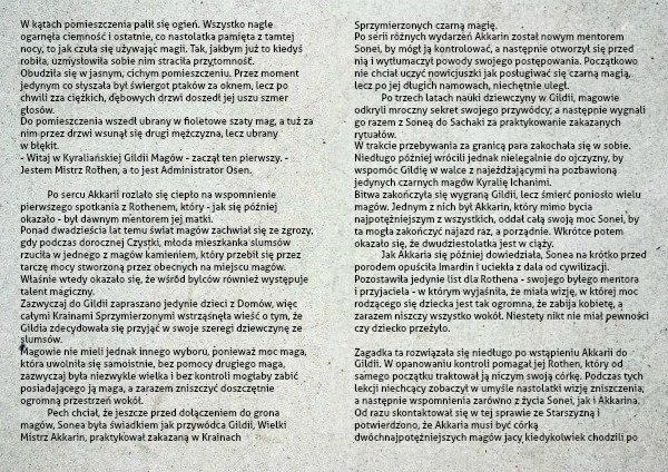 - Witaj w Kyraliańskiej Gildii Magów - zaczął ten pierwszy. - Jestem Mistrz Rothen, a to jest Administrator Osen.