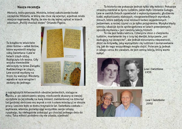 Ta historia nie pokazuje jednak tylko siły miłości. Pokazuje straszny rozdział w życiu ludzkim, jakim było istnienie Gułagu. Lew w swoich listach opowiadał o wykorzystywaniu, głodzeniu ludzi, wykańczaniu słabszych, niesprawiedliwych wyrokach, zimach, które zabijały oraz miskach ledwo wypełnionych jedzeniem, a raczej czymś co je tylko przypomina. Wytyka błędy ustroju, ukazuje życie społeczeństwa w latach powojennych, sposób myślenia – jest swoistą lekcją historii.