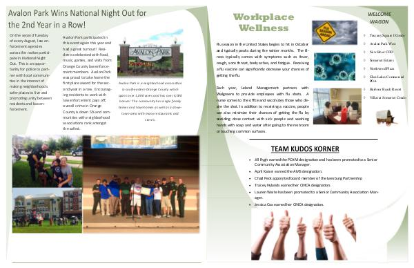 Each year, Leland Management partners with Walgreens to provide employees with flu shots. nurse comes to the office and vaccinates those who desire the shot. In addi on to receiving a vaccine, people can also minimize their chances of ge