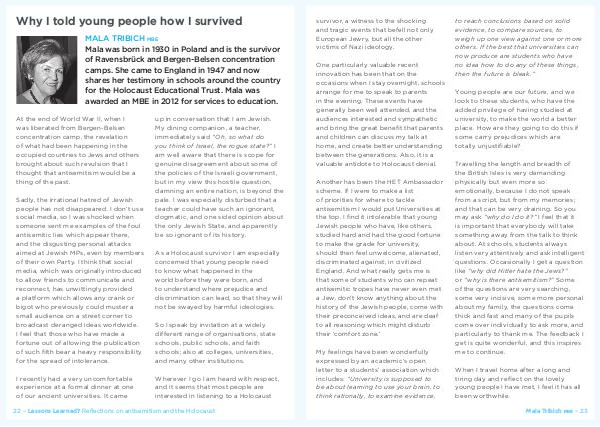 MALA TRIBICH mbe Mala was born in 1930 in Poland and is the survivor of Ravensbrück and Bergen-Belsen concentration camps. She came to England in 1947 and now shares her testimony in schools around the country for the Holocaust Educational Trust. Mala was awarded an MBE in 2012 for services to education.
