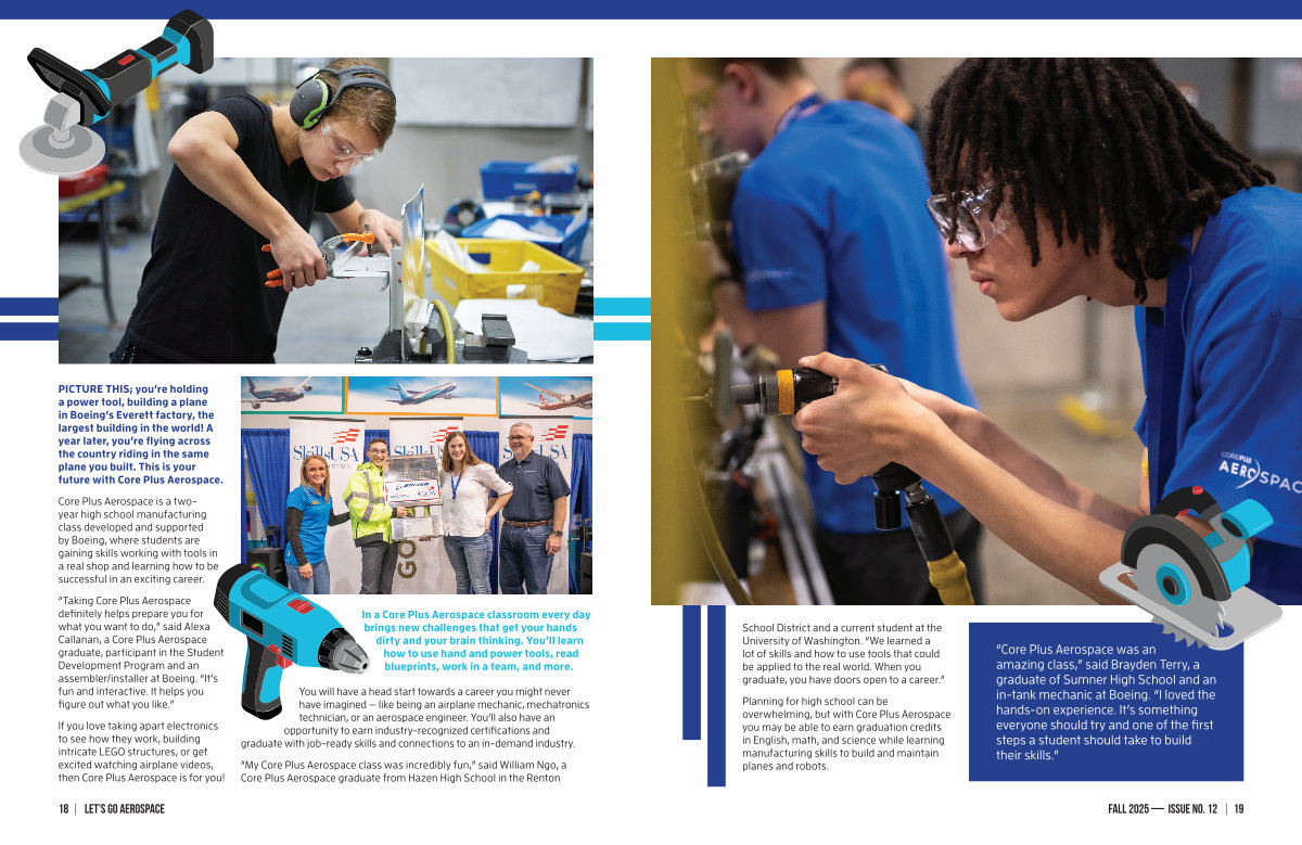 “ Core Plus Aerospace was an amazing class,” said Brayden Terry, a graduate of Sumner High School and an in-tank mechanic at Boeing.“ I loved the hands-on experience. It’ s something everyone should try and one of the first steps a student should take to build their skills.”