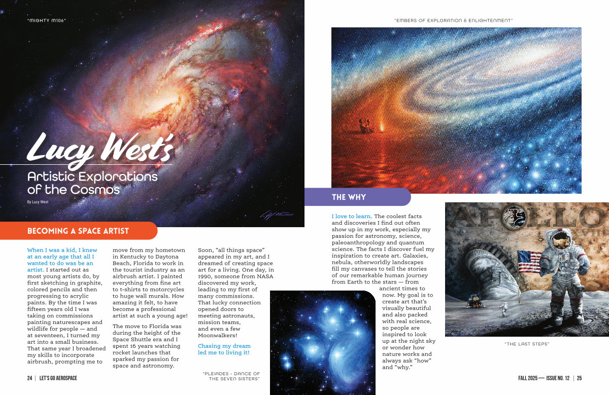 I love to learn. The coolest facts and discoveries I find out often show up in my work, especially my passion for astronomy, science, paleoanthropology and quantum science. The facts I discover fuel my inspiration to create art. Galaxies, nebula, otherworldly landscapes fill my canvases to tell the stories of our remarkable human journey from Earth to the stars— from ancient times to now. My goal is to create art that’ s visually beautiful and also packed with real science, so people are inspired to look up at the night sky or wonder how nature works and always ask“ how” and“ why.”