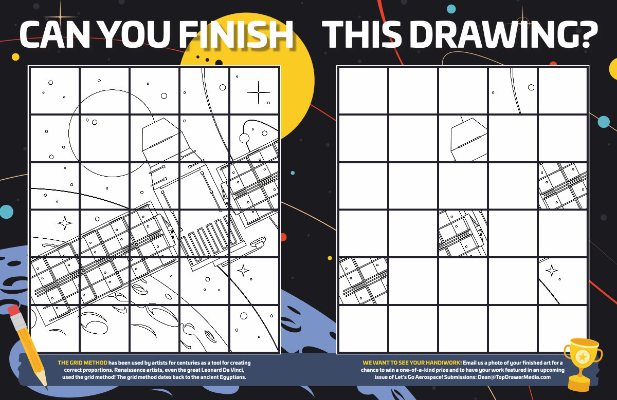 WE WANT TO SEE YOUR HANDIWORK! Email us a photo of your finished art for a chance to win a one-of-a-kind prize and to have your work featured in an upcoming issue of Let’ s Go Aerospace! Submissions: Dean @ TopDrawerMedia. com