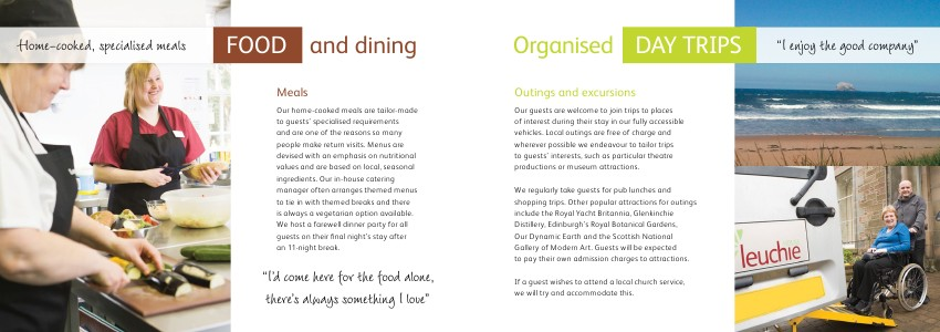 Our guests are welcome to join trips to places of interest during their stay in our fully accessible vehicles. Local outings are free of charge and wherever possible we endeavour to tailor trips to guests’ interests, such as particular theatre productions or museum attractions. We regularly take guests for pub lunches and shopping trips. Other popular attractions for outings include the Royal Yacht Britannia, Glenkinchie Distillery, Edinburgh’s Royal Botanical Gardens, Our Dynamic Earth and the Scottish National Gallery of Modern Art. Guests will be expected to pay their own admission charges to attractions. If a guest wishes to attend a local church service, we will try and accommodate this.