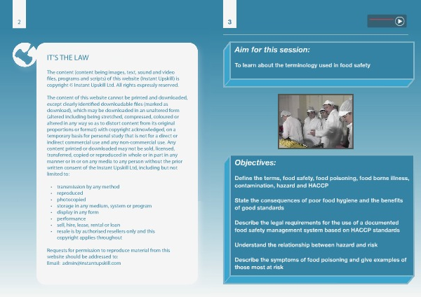 Define the terms, food safety, food poisoning, food borne illness, contamination, hazard and HACCP State the consequences of poor food hygiene and the benefits of good standards Describe the legal requirements for the use of a documented food safety management system based on HACCP standards Understand the relationship between hazard and risk Describe the symptoms of food poisoning and give examples of those most at risk