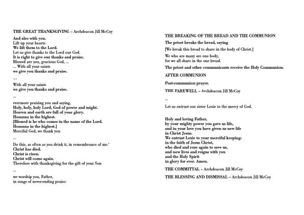 The priest and other communicants receive the Holy Communion . AFTER COMMUNION Post-communion prayer . THE FAREWELL – Archdeacon Jill McCoy … Let us entrust our sister Lexie to the mercy of God .