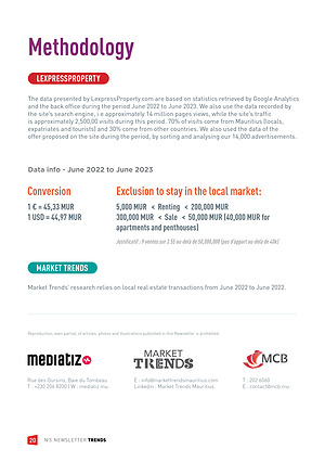 The data presented by LexpressProperty . com are based on statistics retrieved by Google Analytics and the back office during the period June 2022 to June 2023 . We also use the data recorded by the site ’ s search engine , i . e approximately 14 million pages views , while the site ’ s traffic is approximately 2,500,00 visits during this period . 70 % of visits come from Mauritius ( locals , expatriates and tourists ) and 30 % come from other countries . We also used the data of the offer proposed on the site during the period , by sorting and analysing our 14,000 advertisements .