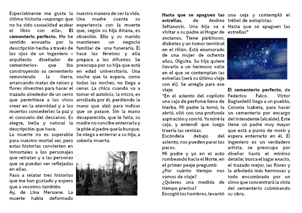 Especialmente me gusta la última historia –supongo que no ha sido casualidad acabar el libro con ella-, El cementerio perfecto. Me he sentido envuelta por la descripción hecha a través de los ojos de un ingeniero –arquitecto diseñador de cementerios- que iba construyendo su cementerio removiendo la tierra, arrancando matas de raíces y flores silvestres para hacer el trazado alrededor de un cerro que permitiese a los vivos creer en la eternidad y a los muertos concederles la paz y el consuelo del descanso. Es alegre, bella y natural la descripción que hace.