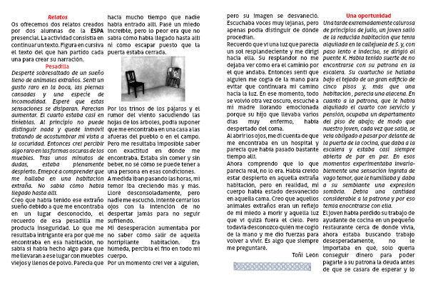 Ahora comprendo que lo que parecía real, no lo era. Había creído estar despierto en aquella extraña habitación, pero en realidad, mi cuerpo había estado desvanecido en aquella cama. Creo que aquellos animales extraños eran un reflejo de mi miedo a morir y aquella luz que ví quizá fuera el cielo. Pero todavía desconozco quién me cogió de la mano y me dio fuerzas para volver a vivir. Es algo que siempre me preguntaré.