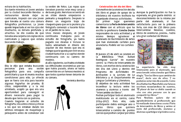 En primer lugar queremos comentaros la Feria de Intercambio de libros con el articulo que ha escrito la profesora Concha Durán responsable de esta actividad y al mismo tiempo agradecer al alumnado de Bachillerato de Artes que han elaborado carteles para anunciarla. Podéis ver los carteles
