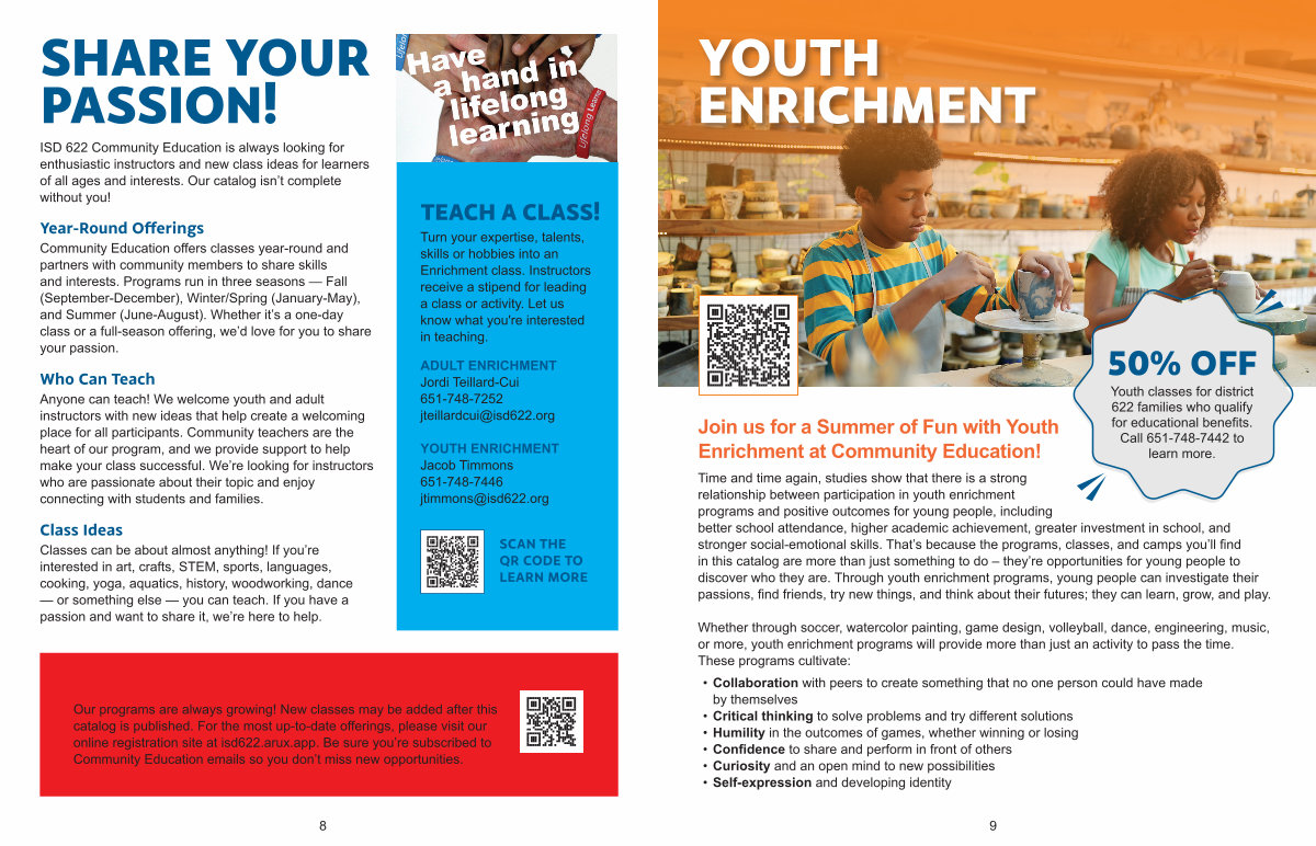 Time and time again, studies show that there is a strong relationship between participation in youth enrichment programs and positive outcomes for young people, including better school attendance, higher academic achievement, greater investment in school, and stronger social-emotional skills. That’ s because the programs, classes, and camps you’ ll find in this catalog are more than just something to do – they’ re opportunities for young people to discover who they are. Through youth enrichment programs, young people can investigate their passions, find friends, try new things, and think about their futures; they can learn, grow, and play.