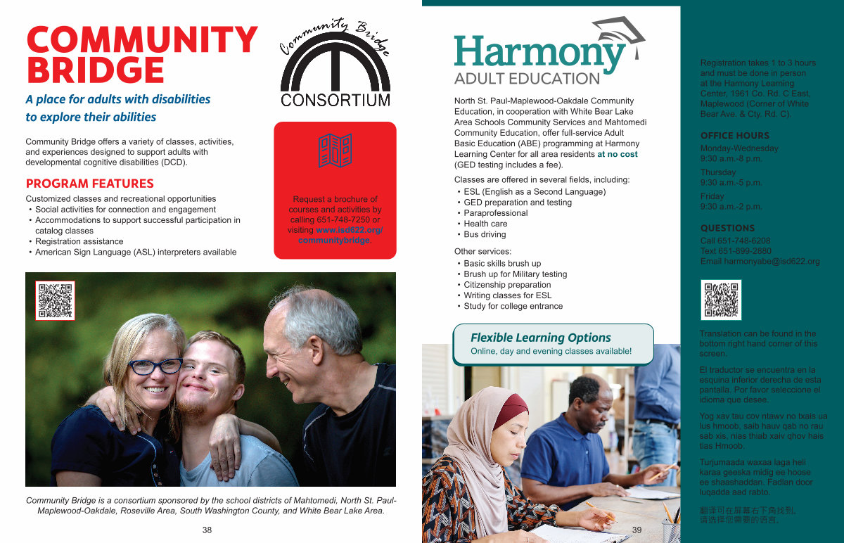 North St. Paul-Maplewood-Oakdale Community Education, in cooperation with White Bear Lake Area Schools Community Services and Mahtomedi Community Education, offer full-service Adult Basic Education( ABE) programming at Harmony Learning Center for all area residents at no cost( GED testing includes a fee).