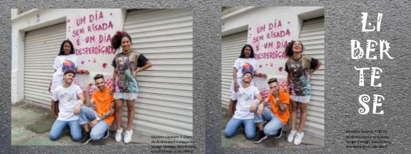 LI BER TE SE Modelos Vestem T-Shirts da direita para a esquerda; Visage Vintage, Zero Drama, Linoclothings e Loja RetrĂ´