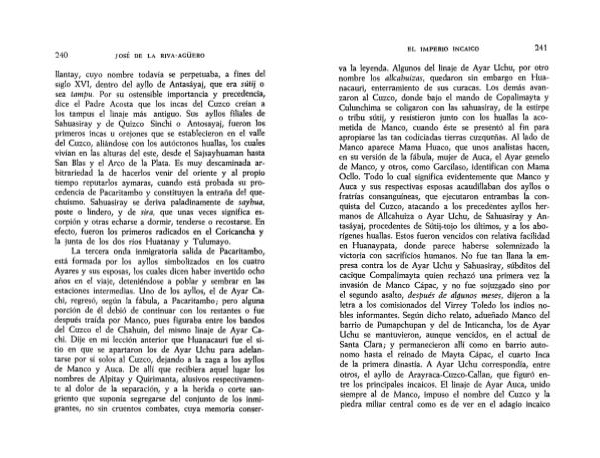 llantay, cuyo nombre todavía se perpetuaba, a fines del siglo XVI, dentro del ayllo de Antasáyaj, que era sútij o sea tampu. Por su ostensible importancia y precedencia, dice el Padre Acosta que los incas del Cuzco creían a los tampus el linaje más antiguo. Sus ayllos filiales de Sahuasiray y de Quizco Sinchi o Antosayaj, fueron los primeros incas u orejones que se establecieron en el valle del Cuzco, aliándose con los autóctonos huallas, los cuales vivían en las alturas del este, desde el Sajsayhuaman hasta San BIas y el Arco de la Plata. Es muy descaminada arbitrariedad la de hacerlos venir del oriente y al propio tiempo reputarlos aymaras, cuando está probada su procedencia de Pacaritambo y constituyen la entraña del quechuísmo. Sahuasiray se deriva paladinamente de sayhua, poste o lindero, y de sira, que unas veces significa escorpión y otras echarse a dormir, tenderse o recostarse. En efecto, fueron los primeros radicados en el Coricancha y la junta de los dos ríos Huatanay y Tulumayo.