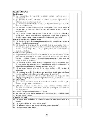 41. ¿ Se presentan estimaciones sobre la variabilidad la precisión diagnostica entre subgrupos de participantes, lectores de pruebas o centros, si amerita?. IV. DISCUSIÓN 42. ¿ Las conclusiones obtenidas en el estudio tienen sustentos científicos y las evidencias respaldan las conclusiones?