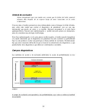 Si no hay esplenomegalia y si la gota gruesa resulta negativa, el médico puede tranquilizar a la madre diciéndole que el diagnóstico de paludismo ha sido excluído. La probabilidad bajo la cual podemos excluir una patología se llama umbral de exclusión. Evidentemente hay que estar consciente del hecho de que se trata de la exclusión de este diagnóstico, y que pueden haber otros diagnósticos que deben ser confirmados o excluídos.