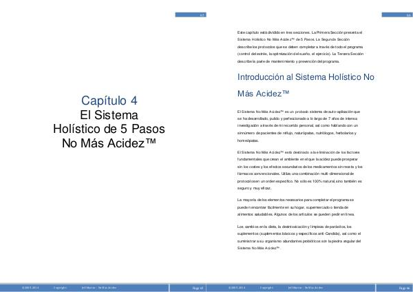 Este capítulo está dividido en tres secciones. La Primera Sección presenta el Sistema Holístico No Más Acidez™ de 5 Pasos. La Segunda Sección describe los protocolos que se deben completar a través de todo el programa( control del estrés, la optimización del sueño, el ejercicio). La Tercera Sección describe la parte de mantenimiento y prevención del programa.