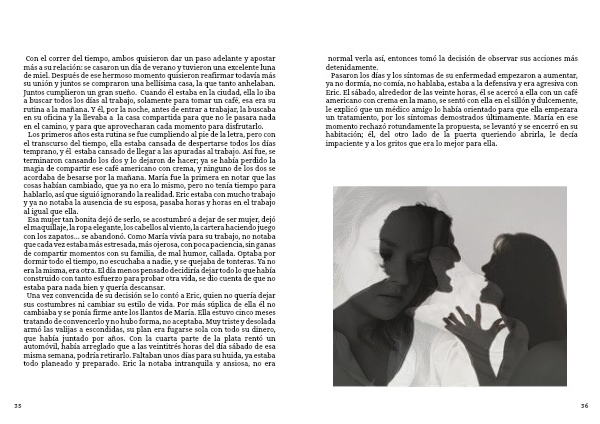 Esa mujer tan bonita dejó de serlo, se acostumbró a dejar de ser mujer, dejó el maquillaje, la ropa elegante, los cabellos al viento, la cartera haciendo juego con los zapatos… se abandonó. Como María vivía para su trabajo, no notaba que cada vez estaba más estresada, más ojerosa, con poca paciencia, sin ganas de compartir momentos con su familia, de mal humor, callada. Optaba por dormir todo el tiempo, no escuchaba a nadie, y se quejaba de tonteras. Ya no era la misma, era otra. El día menos pensado decidiría dejar todo lo que había construido con tanto esfuerzo para probar otra vida, se dio cuenta de que no estaba para nada bien y quería descansar.
