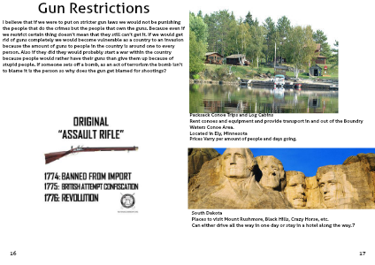 I believe that if we were to put on stricter gun laws we would not be punishing the people that do the crimes but the people that own the guns. Because even if we restrict certain thing doesn’t mean that they still can’t get it. If we would get rid of guns completely we would become vulnerable as a country to an invasion because the amount of guns to people in the country is around one to every person. Also if they did they would probably start a war within the country because people would rather have their guns than give them up because of stupid people. If someone sets off a bomb, as an act of terrorism the bomb isn’t to blame it is the person so why does the gun get blamed for shootings?