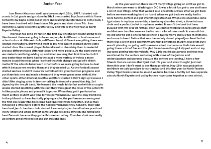 As the year went on there wasn’t many things going on until we got to March when we went to Washington D.C it was a lot of fun got to see and learn a lot of cool things. After that we had solo ensemble a week after we got back before we were working hard on it and when we got back we really had to work hard to perfect and get everything refreshed. When solo ensemble came I got a two in my bass ensemble, a two in my chamber choir, a three in brass choir and a perfect ballot in my brass sextet. It wasn’t the best but I was pleased with my over all ratings. Then we started working on large group stuff and that was hard because we had to learn a lot of new music in a month but we did and we got a one in mixed choir, a two in men’s choir, a two in women’s, and a one in band. Before that was the variety show I played jazz band in that there was a lot of good and funny acts that performed. In April was prom but I wasn’t planning on going until someone asked me because their date wasn’t going it was a lot of fun and I’m glad I went even though I slipped and cut my leg open getting into the vehicle. May 11th was baccalaureate and that was emotional for the seniors and along with some of the juniors and underclassmen and parents because the seniors are leaving. I have a few friends that are seniors that I just met this year and even though I just met them this year I don’t want to see them go either. May 18th was graduation and there we said goodbye to our seniors and this first year as North Fayette Valley Tiger hawks comes to an end we have become a family not two separate schools North Fayette and valley but we have come together as one school.