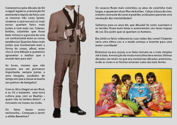 Comecemos pela década de 60 a seguir à guerra, a revolução foi eminente e depois de fatos com as mesmas três cores (preto, cinzento e azul escuro) os mais novos queriam fatos mais justos e com mais cor. Colares, botões, colarinho que fosse bem vistoso e a gravata de uma cor contrastante eram as novas tendências! Queriam fatos mais justos que mostrassem mais a forma do corpo, afinal, estar vivo é uma bênção e queremos aproveitar o melhor que o mundo tem para dar!