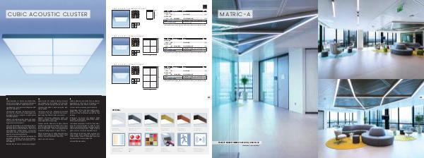 Acoustic and LED modules to be highly effective absorbers regulating the reverberation time. Possible to install as single version or in clusters with different configurations. Uniform design guarantees uncluttered ceiling look even in power-off state.