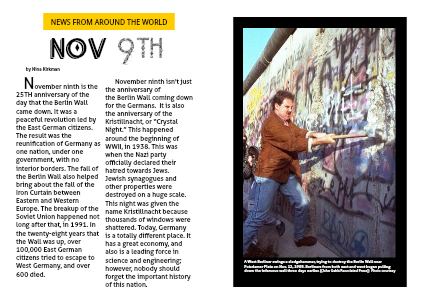 the Berlin Wall coming down for the Germans. It is also the anniversary of the Kristillnacht, or “Crystal Night.” This happened around the beginning of WWII, in 1938. This was when the Nazi party officially declared their hatred towards Jews. Jewish synagogues and other properties were destroyed on a huge scale. This night was given the name Kristillnacht because thousands of windows were shattered. Today, Germany is a totally different place. It has a great economy, and also is a leading force in science and engineering; however, nobody should forget the important history of this nation.
