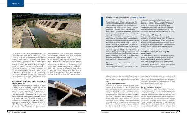 Una situazione non del tutto risolta , ma gestita e sotto controllo “ Sì , sotto controllo e monitorata , anche per l ’ onerosità del lavoro : non possiamo dimenticarci che negli anni Settanta abbiamo avuto capannoni di migliaia di metri quadri ricoperti d ’ amianto , che allora sembrava la soluzione ideale . Bonificare queste dimensioni è un ’ operazione davvero costosa e quindi è assolutamente utile aver innescato questo monitoraggio ”. potrebbe essere uno strumento utile a far prendere coscienza del problema acqua e impermeabilizzazione del suolo , ma la coperta degli incentivi è sempre molto corta ”. La norma in materia è adeguata ? “ La domanda si presta a più risposte , perché nella pratica il Decreto Legislativo 156 è un imperativo categorico per il privato , che si trova assoggettato alle prescrizioni e agli obblighi in una modalità decisamente cogente , ma c ’ è da constatare come le prassi di valutazione previste dalla legge mettano a disagio progettisti , costruttori e committenti perché richiedono analisi e vedono poi tempi di risposta da parte della macchina burocratica piuttosto inadeguati , sia sul fronte dell ’ edilizia residenziale sia su quello delle costruzioni industriali – commenta Erroi con un pizzico di disappunto – Analisi importanti sono sicuramente necessarie quando parliamo dell ’ impatto che una costruzione di tipo industriale va ad avere sul sistema idraulico del territorio , ma stiamo parlando di situazioni che potrebbero essere modellizzate all ’ interno di quadri più ampi e non vivisezionate di volta in volta ”.