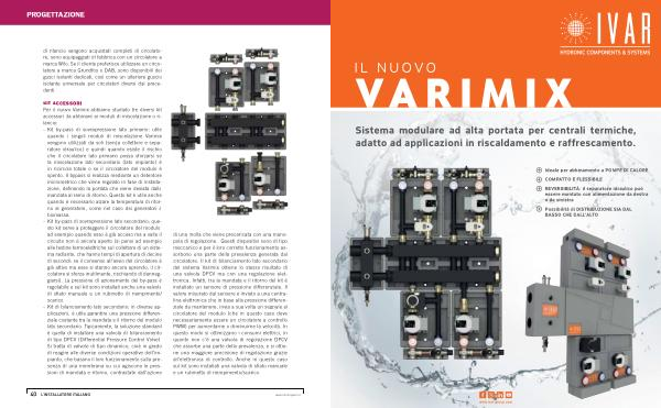 KIT ACCESSORI Per il nuovo Varimix abbiamo studiato tre diversi kit accessori da abbinare ai moduli di miscelazione o rilancio : - Kit by-pass di sovrapressione lato primario : utile quando i singoli moduli di miscelazione Varimix vengono utilizzati da soli ( senza collettore e separatore idraulico ) e quindi quando esiste il rischio che il circolatore lato primario possa sforzarsi se la miscelazione lato secondario ( lato impianto ) è in ricircolo totale o se il circolatore del modulo è spento . Il bypass si realizza mediante un detentore micrometrico che viene regolato in fase di installazione , definendo la portata che viene deviata dalla mandata al ramo di ritorno . Questo kit è utile anche quando è necessario alzare la temperatura di ritorno al generatore , come nel caso dei generatori a biomassa .