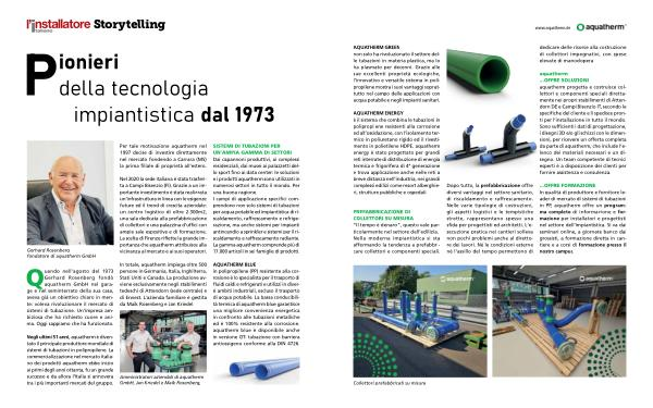 Quando nell ’ agosto del 1973 Gerhard Rosenberg fondò aquatherm GmbH nel garage e nel seminterrato della sua casa , aveva già un obiettivo chiaro in mente : voleva rivoluzionare il mercato di sistemi di tubazione . Un ’ impresa ambiziosa che ha richiesto cuore e anima . Oggi sappiamo che ha funzionato .