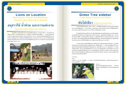 ไลออนส์ชาวเกาหลีจะเป็นเจ้าภาพการประชุมใหญ่ไลออนส์สากล ประจ�ำปี ครั้งที่ 95 ไลออนส์ประมาณ หมื่นคนจากทั่วโลก ประชุมในเดือนมิถุนายน ณ เมืองพูซาน เช่นเดียวกับไลออนส์ที่อื่น ๆ การบริการของไลออนส์ เกาหลี ท�ำงานอยู่บริเวณขอบเขตของงาน ไลออนส์ โอซู ในภาค 356 ซี ขุดท้องร่องเพื่อช่วยซ่อมพื้นที่น�้ำท่วม พวก เขายังแจกจ่ายสิ่งของและอาหารแก่ผู้ประสบภัยพิบัติน�้ำท่วมด้วย ไลออนส์ ยุงยาง ในภาค 356 อี ตัดหญ้าที่อนุสาวรีย์ แห่งชาติ แสดงให้เห็นว่าพวกเขารักการบริการไลออนส์ในพื้นที่ กันแซน ในภาค 356 ซี เป็นเจ้าภาพงานแต่งงานให้แก่ คู่นานาวัฒนธรรมจ�ำนวน 10 คู่