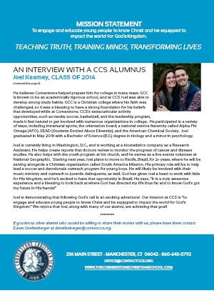 Joel is demonstrating that following God’s call is an exciting adventure! Our mission at CCS is “to engage and educate young people to know Christ and be equipped to impact the world for God’s Kingdom.” We rejoice that Joel, along with many of our alumni, are achieving that goal!