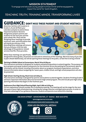 Attention, families with students in Grades 5, 8 and 10! Mark your calendars and plan to attend these important Guidance Sessions designed to prepare parents and students for the next year and the years ahead. Mrs. Press will be designing these meetings to provide resources, tools, and information that will equip you and your child. Attending these meetings will ensure that you and your child can take advantage of the guidance-related services that Mrs. Press provides.