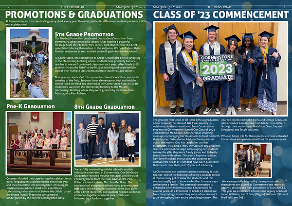 Succesfully completing middle school is another milestone celebrated at Cornerstone. Our 8th Grade Graduation featured moving messages and words of encouragement from the class advisor Mrs. Pam Roberts, as well as from Mrs. Jennifer Brey. The students had also prepared two video presentations that were shared; student speeches were also given. After a brief reception, our students headed out for an afternoon together at a local park, which was followed by a fun lunch together.