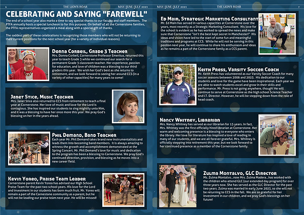 Mrs. Janet Stice also returned to CCS from retirement to teach a final year at Cornerstone. Her love of music and love for the Lord is contagious. She has inspired our students to sing mightily unto Him, and it was a blessing to have her once more this year. We pray God’s blessing on her in the years ahead.