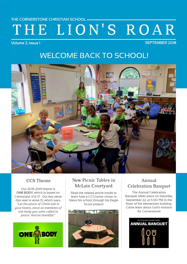 Banquet takes place on Saturday, September 22, at 5:00 PM in the foyer of the elementary building. Come learn about God's mission for Cornerstone!